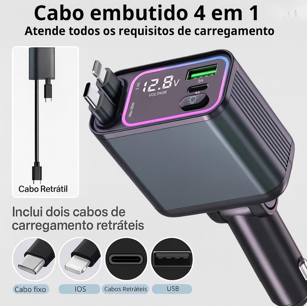 Carregador Veicular Turbo Retrátil 4 Em 1 Usb Tipo-c 120w Preto