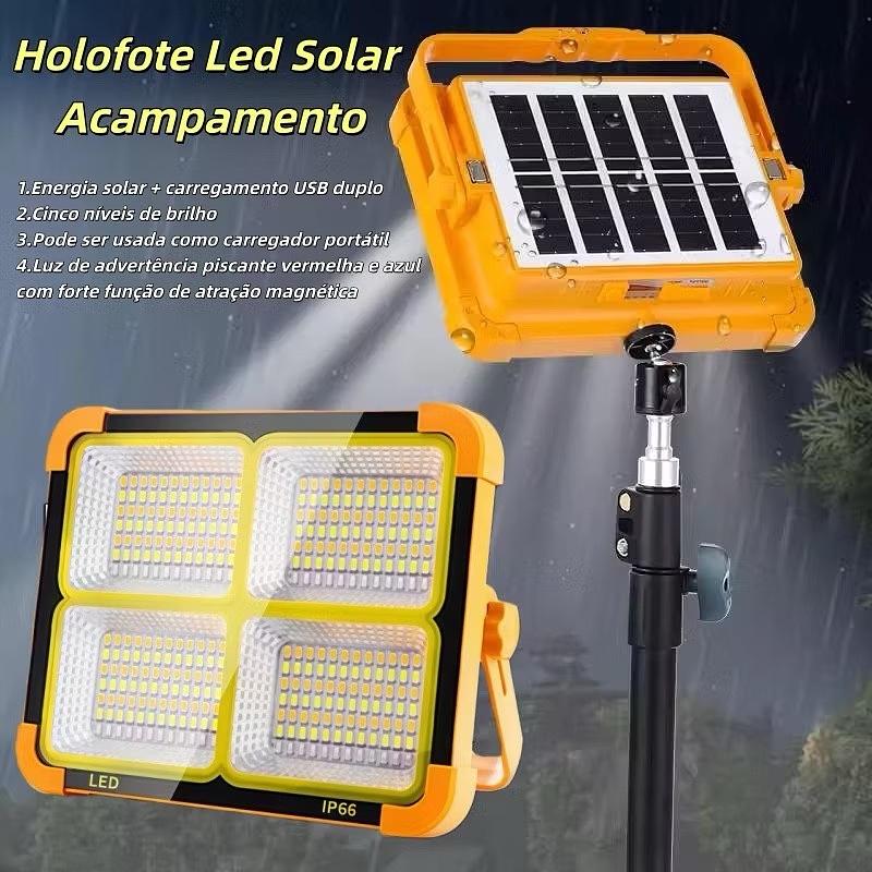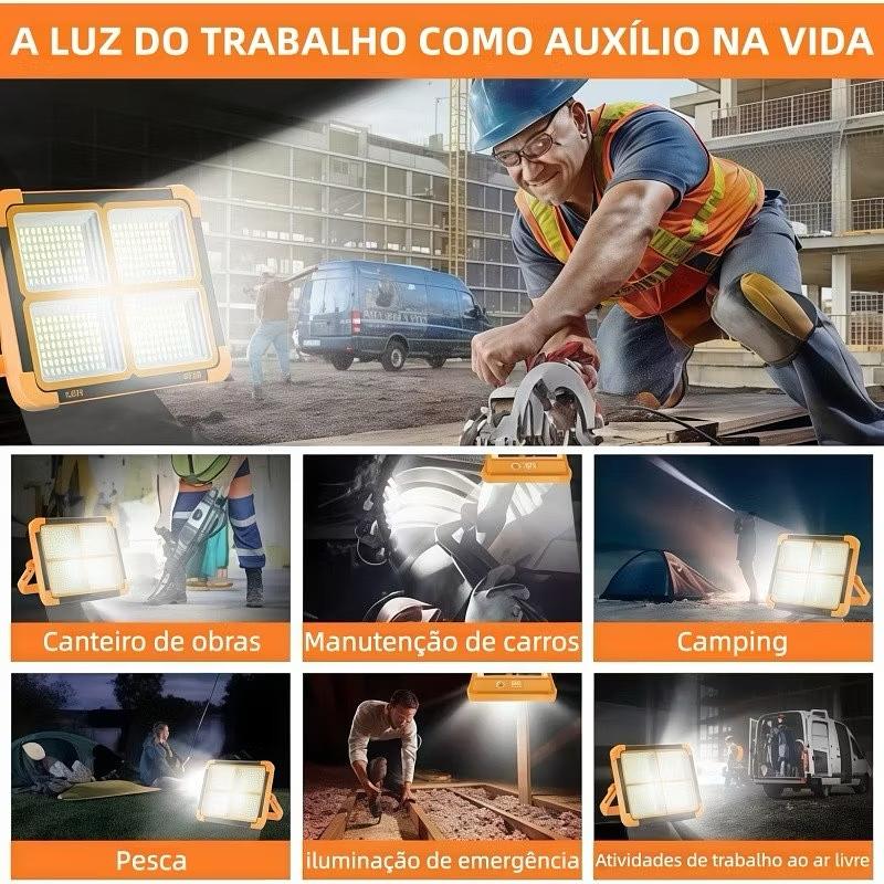 Refletor LED portátil alimentado por energia solar, recarregável via USB, para uso em trabalhos.